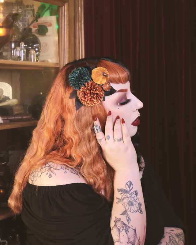 Retrouvez le rayon automne, entre citrouilles, feuilles mortes et Halloween, cette collection regroupe des ambiances orangées, spooky, dark et étrange. Entre horreur et vintage occulte. Si vous êtes une ghoul, tantôt gothabilly, tantôt psychobilly, une pin up ou bien gothique, alors vous êtes au bon endroit. Créatrice spécialisée dans l’univers rétro, je propose des fleurs pour cheveux pin-up, des illustrations, de la peinture et de la décoration, faites mains en Auvergne. Je propose aussi des accessoires vintage et des relookings inspirés des années 40-50. Retrouvez des bibis, hairflowers, créations personnalisées, accessoires et autres pour vos événements, mariage, show burlesques, pour les fêtes et diverses soirées ou spectacles.